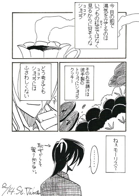 バレンタイン当日にいろいろ平行しながら下書きを始めた上に 風邪なんぞひいてたものですっかり仕上げるのが遅くなってしまいましたバレンタインルパルブ。 面と向かってそれらしいものを渡すのが気恥ずかしいルブランさん。 いつものお茶の時間にさりげなく、と思ってたら作り過ぎでバレました(笑)