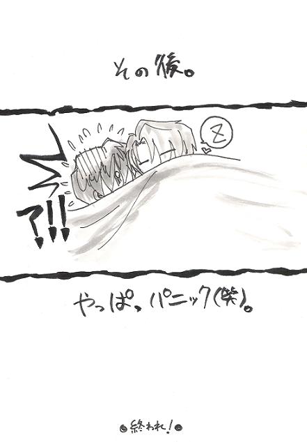 雑でごめんなさい・・・ てゆーか山も落ちもなくてごめんなさい・・・(嘆) なんだか描いてるうちに延々と甘々を垂れ流しそうな感じになったので強制終了しました;;; もすこし落ち着いて描ける状態を早くくれぇ〜〜〜(T□T)