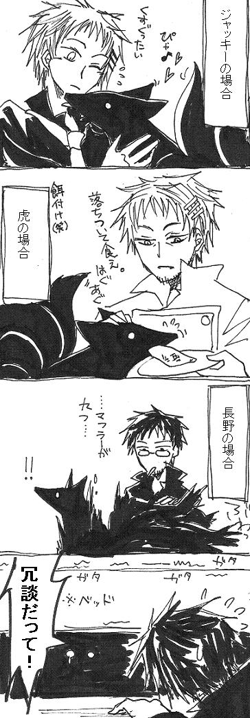 さっしさんへのお見舞い品その3。 さっしさん宅部下s(ジャッキー・虎・長野)とけも20が会ったら。 ジャッキーは優しいっぽかったので普通に懐きそう 虎はコックなので餌付け(ぇ) 長野は貧乏くじで嫌われました(笑)