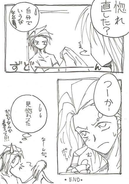 裸体はあんま描いたことが無く苦手なんですが何か。 ハルヒは隠さない派っぽいのでこうなりました。 曝けるのは平気でもキスはとんでもなく恥ずかしいというちょっと変わった子です^^ そしてやはり翻弄されてるのはリパー。かかあ天下です(笑)